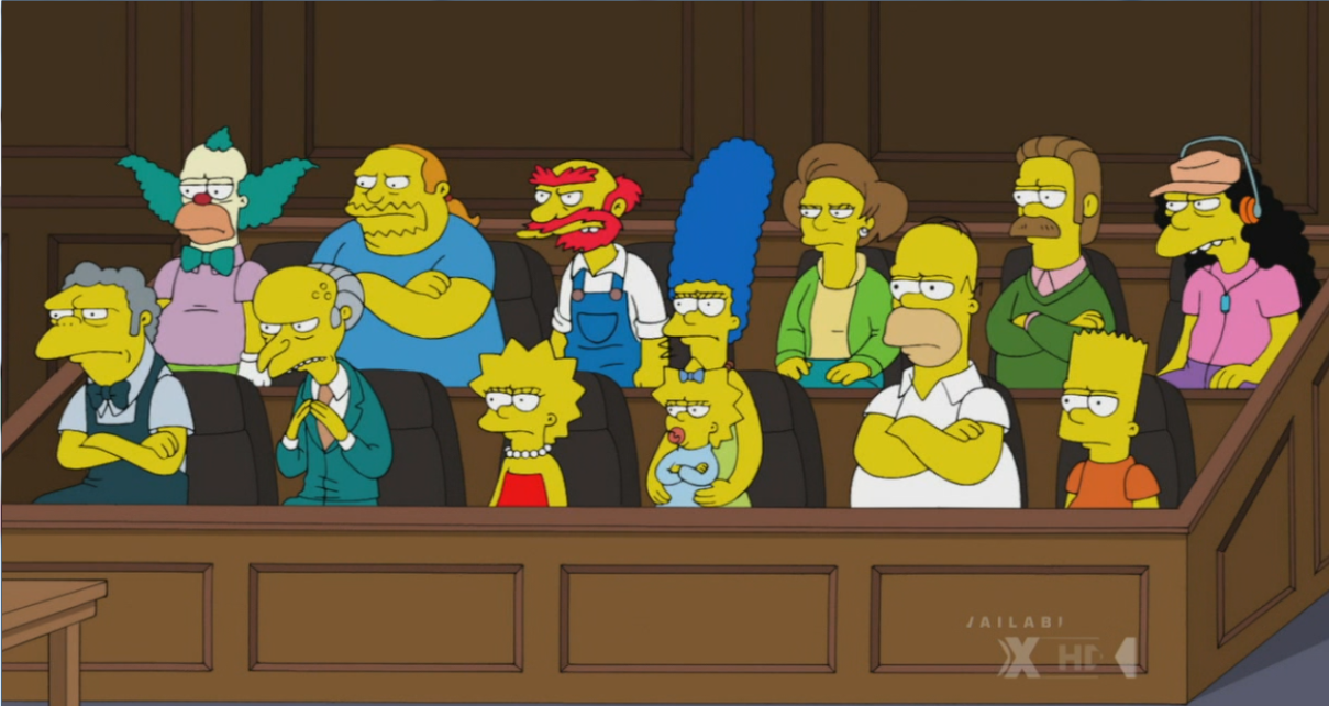 In "Cool Hand Peter", the jury of the trial of Peter, Joe, Quagmire and Cleveland consisted of Homer, Marge, Lisa, Bart, and Maggie Simpson, Krusty the Clown, Comic Book Guy, Groundskeeper Willie, Edna Krabappel, Ned Flanders, Otto Mann, Moe Szyslak, and Mr. Burns. Peter is at first relieved to find that it's a jury of their peers but Joe points out that they don't see it that way.