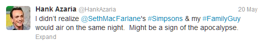 Seth guest starred in the The Simpsons episode "Dangers on a Train", which premiered the same evening Hank Azaria guest starred in "No Country Club for Old Men".